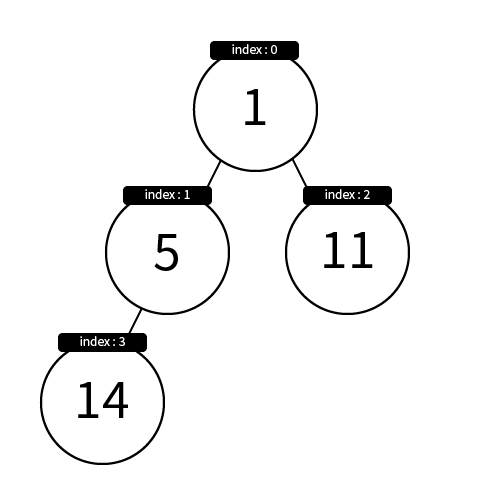 가장 작은 원소인 1이 가장 앞으로 왔습니다. 해당 인덱스를 기준으로 이진트리를 그리면 다음과 같은 모습입니다.