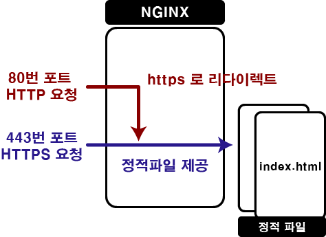 API 서버를 따로 만들 필요가 없는 프로젝트였기 때문에, 단순히 GET 요청에 대해 정적 파일만 제공해주면 된다고 생각했습니다. 다만, HTTP 접속 시 모든 연결을 HTTPS로 리다이렉트 해야한다고 생각했습니다.