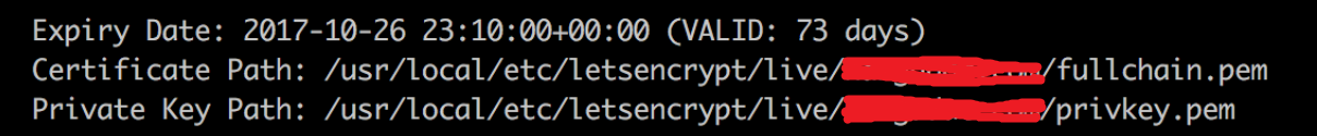 도메인에 대한 인증서와 개인키가 성공적으로 받아졌다면, 다음과 같이 인증서와 개인키의 위치가 표시됩니다.