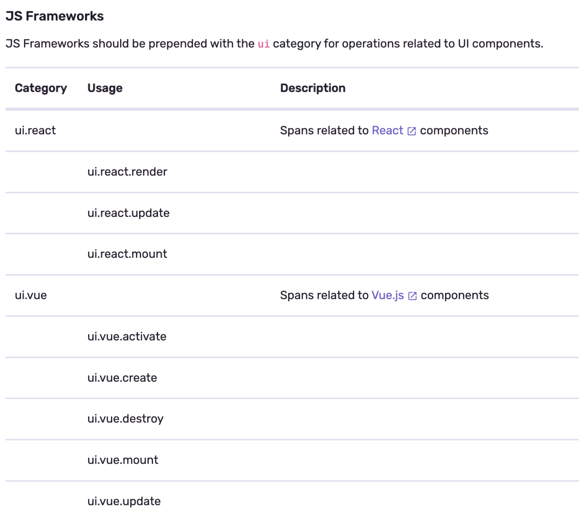 | Sentry Docs 를 보면 Operation 종류들을 볼 수 있습니다. | 실제 Sentry 에 수집되는 Span 데이터 |