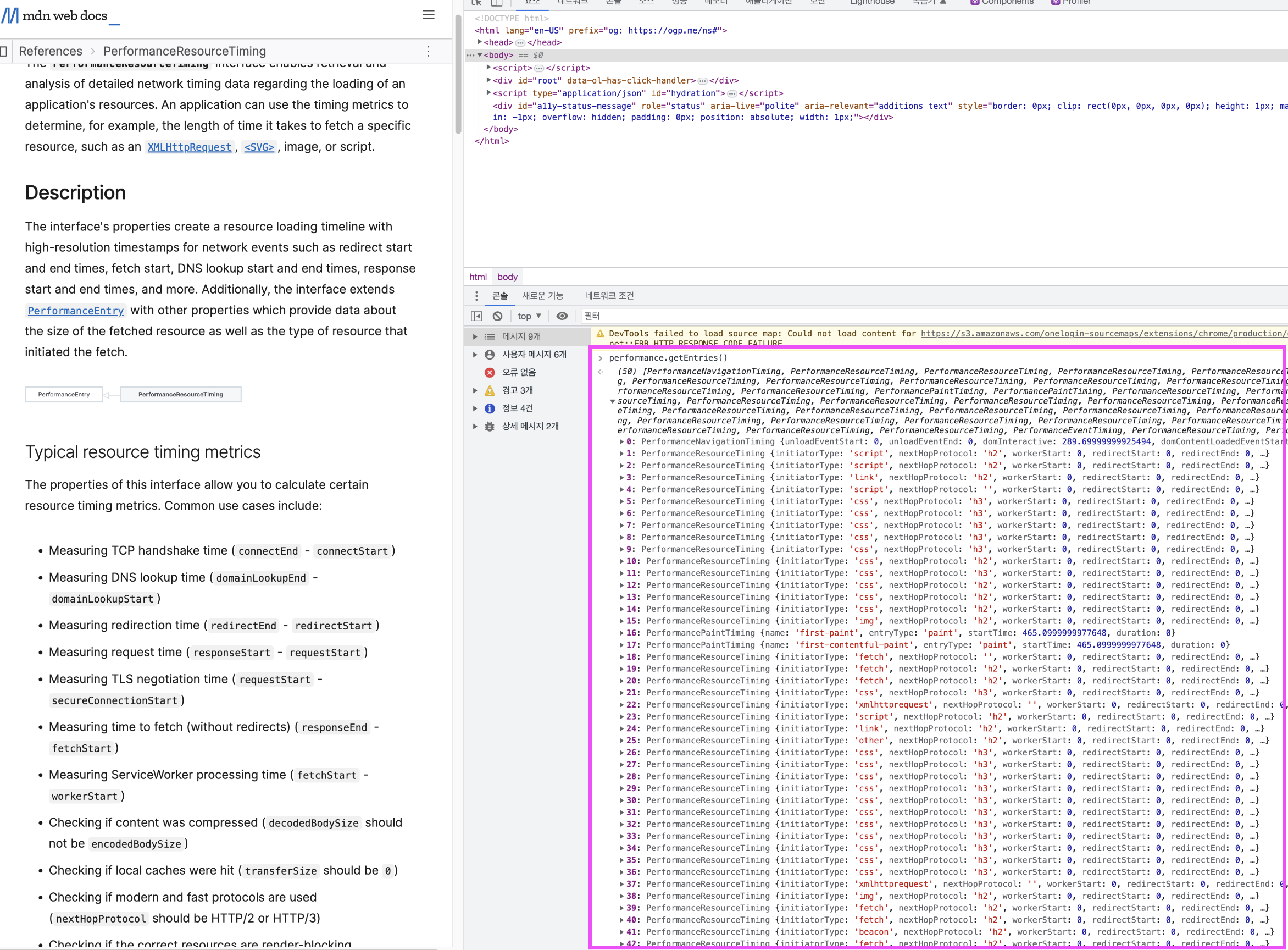 왼쪽 리스트를 보게되면 Performance API가 데이터를 측정하는 인터페이스 종류에 대해 살펴볼 수 있습니다.