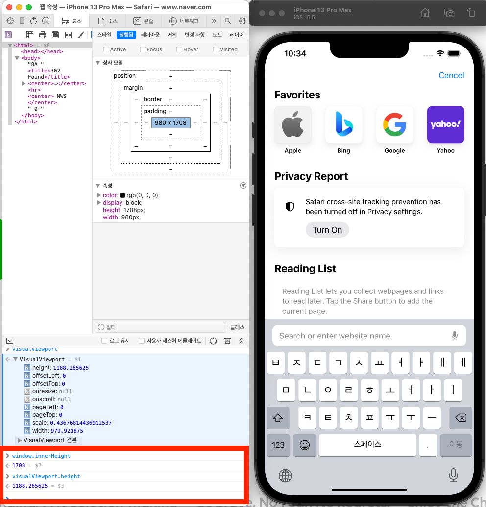 - height: 사용자가 보고 있는 뷰포트의 높이 (CSS 픽셀 단위)