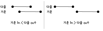 기준으로 선택한 자동차의 나가는 시간과 다음 자동차의 들어오는 시간을 비교해야 하는데 나가는 순으로 정렬되어 있다면 위 경우 처럼 다음 자동차의 나가는 시간이 기준 자동차의 나가는 시간보다 앞서는 경우는 계산하지 않아도 되기 때문이다.
